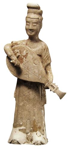 陶黄釉持琵琶女俑   唐