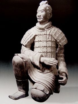 我们就从二号坑的跪射俑说起。这类武士俑,头绾发髻,身着战袍,外披铠甲,右膝着地,左腿弯曲,身体微微前倾,双目凝视前方,胸前的两手一上一下,作控弓之状。虽然弓箭已不存,但仍可感觉到准备射击的紧张态势。兵马俑中的立俑都突出其身材高大、体格健壮,而这类跪射俑则更突出其矫健灵便之态,突出其伺机而动、蓄势待发的神情。他们面部的神情也充满生机,眉低垂,鼻微张,耳朵侧竖,正是静听八方之音、等候出击的样子。人身上铠甲的缝褶,也随着人物的动态而显示出变化。人物蹲跪所形成的力点差异,也惟妙惟肖地表现了出来。这样的雕刻,细致入微,使观看的人,似乎觉得他活了起来。