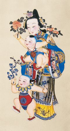 年画的喜庆气氛,在杨柳青年画中体现最为充分。这里出品的年画清新活泼,具有浓郁的生活情调。如一幅《母子图》,画湖边的庭院,院子里有湖石假山、花卉,妈妈站在窗前,拿着扇子,招呼着窗外嬉戏的儿子。胖胖的小家伙穿着小肚兜,一只手拿着一个小木棍,木棍的顶端有一只小鸟。一片祥和温暖的气氛,是一幅温情的生活画面。