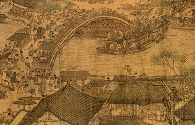 长卷向前,便是中段的高潮处,也是全画的中心,描写的是汴梁当时的中心虹桥地带。巨大的木桥凌空飞架,如彩虹饮涧。桥上人头攒动,商贾云集,有过路的,嬉戏的,最引人注意的是,桥上很多扶着栏杆向下观望的人,有的指手画脚,有的大声惊呼,有的惊恐不已。而在桥下正有一大船要经过,巨大的船体前低后高,船头有指挥者,大张着口,挥舞着手臂,有人以撑竿顶着桥下的底座,矫正着方向,船工奋力地摇着橹,顶篷上人们快速地摇下帆,大船向桥下驶去,水中还留下船快速向前所激起的漩涡。船将过未过,船上的人紧张,桥上观看的人也紧张,桥上桥下连成一体,人们紧张的心情伴着急速的水流而盘旋。