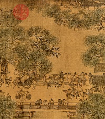 打开《清明上河图》,一个广阔的生活世界展开在我们面前:一个孩子领着几只毛驴,驮着木炭,过一座小桥,五个纤夫拉着一条大船往上游行走;一批搬运工,背着从船上卸下的货物,手上还拿着一根计数的筹码;大船放倒船桅要驶过虹桥,船上人手忙脚乱,四周无数人在观看、呼叫,帮助出主意;桥上挤满了行人、毛驴、轿子,还有两个人拉开架式在吵架;桥头乱糟糟地摆满了货摊、地摊;脚店楼上几个客人在喝酒;木匠师傅在店门口制造车轮;摆地摊卖膏药的人吸引了一圈人听他胡吹;一家大户人家门口,七八个佣人在闲坐,有一个干脆躺在地上睡觉;算命先生的棚子里挂着“神课”、“看命”、“决疑”的招牌;城楼外无数牛车、独轮车、挑夫;几头骆驼正穿过城楼;城楼下有人正在理发,城楼里面堆着一些货物,有人正在报关;紧接着是卖大木桶和弓箭的小店,店中一人正在拉弓,一人口咬绑带正为自己绑上护腕;再接着是“孙羊正店”,这是大酒楼,楼上宾客满座,后院倒叠着无数酒瓮;再接着是一家肉铺,挂着“斤两十足”的牌子;再过去有客栈、香料铺、绸缎铺、药铺、当铺,药铺中一位妇女抱一个小孩,另一位妇女捧碗正要给小孩服药;还有一口沿街水井,三个人正在打水;最后是一家大宅院,门前有家丁坐在下马石上闲聊;大街上有各种货摊,卖花的,卖清凉饮料的,卖甘蔗的,骑马的,坐轿的,挑担的,推车的,走路的,还有许多四匹马拉的大车;行人中有拿锯的,有拿扇遮头的,有和尚、道士,还有像玄奘那样背着行李的行脚僧,总之是各式人等,应有尽有。有人数过,画面上出现的一共有七百七十多人。