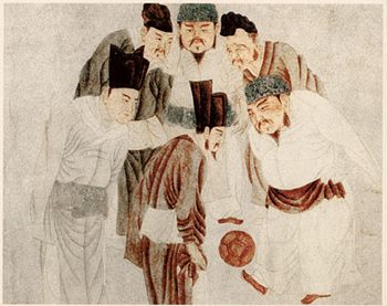 中国古代绘画中有很多关于踢球的描写。宋代画家苏汉臣有一幅《长寿百子图》,画的是一群孩子在一起玩球的场面,其中一个孩子正在抬脚踢球。元代初年画家钱选有一幅《宋太祖蹴鞠图》,画的是宋太祖赵匡胤与他的五位大臣在一起踢球的场面,众人围着一个圆圆的球,争先恐后用脚去踢,高高在上的皇帝也玩得乐不可支。