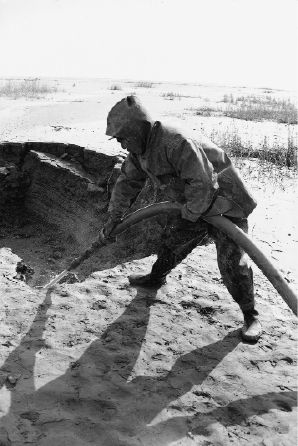 工人把淤泥化在浊水里,然后把水再泵回黄河