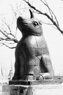 上岸后,我取回自行车,蹬车返回开封。天色尚早,我便循着来时的路往回走。大约走了一半,我决定顺着一条通往北郊的辅路去看看开封有名的“犀牛”。那是一头铁犀牛,蹲在那里已经五百五十多年了。把它放到那里,是为了防止黄河发洪水。理由是,牛性属坤,而坤属土,土可以克水;《周易》上说“坤者,顺也”;此外铁生水,铁乃水之母,子不能与母斗;又中国传说有“辟水犀”,出入水中,水为之开。总而言之,原因很多。这套学说想来或许有它的道理。当年明朝人把铁“犀牛”放那儿的时候,黄河正从它的面前流过,可打那以后,黄河向北撤退了十公里。我想开封市民一定非常感谢这头“犀牛”,不过,这种感谢应该只是发自内心而没有任何实际的表示。因为这头铁“犀牛”看上去是那样地凄凉孤独,被一大片等待种玉米或棉花的农田包围着,连一个看护它的人都没有。