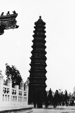 我拍了拍铁“犀牛”的腿,蹬车前往该市的另一个标志性建筑——开封铁塔。这座塔其实并不是铁的,只是塔身通体以琉璃砖贴饰,看起来像铁的一样,因此人们都管它叫铁塔。走近仔细观察,我发现那些看似光滑的琉璃砖的表面,实际上隐藏着各种佛像、传说和天堂景象的花纹图案。看塔人告诉我,图案有五十种之多,多为佛教人物和故事。要把五十种图案看全了,非得有望远镜不可,可那天我忘带了。这座塔是中国最高的琉璃塔建筑,高五十六米,共十三层,建于北宋。建塔的目的是奉祀一件佛顶骨舍利,现在,这件舍利早已转到上海南郊的一座寺庙里了。