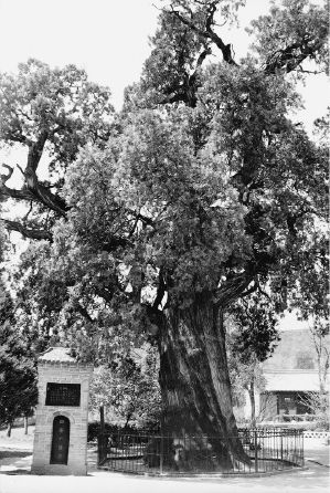 黄帝陵所在的小山叫桥山,有一条水泥路从高速路岔开通向那里。我不禁注意到,其他山都是光秃秃的,只有桥山郁郁葱葱。显然,砍桥山上的树违法,而砍其他山上的树却无所谓。在上桥山的半路上,我驻足在一座大殿前。在过去的两三千年里,官员们就是在这里祭祀黄帝的。但是,我印象更深的不是大殿本身,而是它院子的那些古老柏树。据说特别大的一株是黄帝亲手种下的;另有一株则是两千一百年前汉武帝来祭祀黄帝时种下的。
