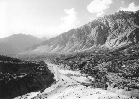 苏斯特到古尔梅特一路上的风景最突出的特征就是荒芜的山谷,偶尔在开阔地带有个村庄。虽然看起来好像亘古已有,但是这种荒凉才是近几年的事。1974年的一场大地震后,多处滑坡阻塞了罕萨河,形成了一个巨大的、几乎长达20公里的堰塞湖。当河水最终突破了天然的堤坝时,古尔梅特和苏斯特之间的大部分肥沃土地已经被埋在层层的淤泥和沙砾之下。经过帕苏小镇(Passu)时,司机告诉我们:1974年之前,山谷这一带的居民是现在的5倍之多。这里的居民以前靠出售杏干和其他干果为生。但是现在他们的果园不复存在。那些决定留下来的人通过为前来喀喇昆仑山峰和冰川探险的旅游团提供服务而勉强糊口。如果你喜欢徒步旅游,帕苏被公认为一个有着最好导游的徒步旅行之地。但是我们并没有停下来亲自一试,因为我们与古尔梅特村南那长达6公里的塌方地带有个 “约会”,那里可以提供足够的徒步旅行。离开苏斯特两小时后,我们到了“约会”地点。我们本不愿意在暴雨中艰难地穿越又一个滑坡,但别无选择。可是,我们刚到,天空突然放晴,阴霾散尽,阳光明媚。