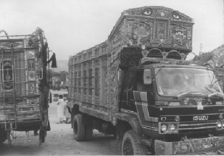 说到这里,我们的茶也品完了。我和芬恩起身离开,经过几十个卡车司机身旁。他们的卡车就停在外边,这是我们第一次有机会近距离地观察这些艺术作品。像我们这样的外国旅游者,从机场去宾馆的路上最先注意到的就是每一辆类似流动的展览馆的车辆。卡车、巴士、出租车,甚至人力车都涂得花花绿绿,从头到脚挂满了饰物。我估计,希罗尼穆斯·波希(希罗尼穆斯·波希(1450—1516年),荷兰宗教画家,被誉为“现代绘画的始祖。”——译者注)被迫重返人间,现在正生活、工作在巴基斯坦为他的荒诞派画作赎罪。