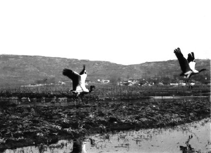 陈先生说,1985年政府建立自然保护区的时候,划出了一块25平方公里的地方,其中湖本身的面积占20平方公里,另外5平方公里是湖周围的沼泽地。当我们的船穿过水道前往沼泽地的时候,突然间拐入临近的一条水道,局长告诉我别动。一对黑颈鹤正站在不到30米外的田里,船工向着鹤所在的方向划过去。黑颈鹤是世界上最稀有的鸟类之一,是鹤家族中最珍稀的品种。受到保护后,它们的数量从原来的几百只上升到目前的上千只,其中1/3每年秋天来临的时候,从它们在黄河源头附近的栖息地,南飞来到草海湖过冬。陈先生说,此前世界野生动植物联合会的会长曾4次来到这里,观赏黑颈鹤。我们继续接近它们,15米,10米,5米,这时它们飞了起来,缓慢而优雅。它们盘旋着从我们的小艇正上方飞过,飞得很低,我甚至感觉到它们翅膀带起来的风。这种鸟体型巨大,身体是白色的,初级飞羽是白色,次级飞羽呈黑色,脖子也是黑色的,两眼中间有块红斑。局长估计它们体重大约在8公斤,大约是加拿大野鹅的两倍。我还是个孩子的时候曾经在爱达荷州打过野鹅,但从来没有得手过。野鸭子就没有这么好的运气了。我14岁那年,某一天突然爆发,一连射下来24只绿头鸭,害得我们每天吃鸭子,足足吃了一个月,而一只黑颈鹤就足够吃上一个月的。这次它们离我太近了,绝不会失手,我瞄准了两只鹤——当然是用我的尼康相机。