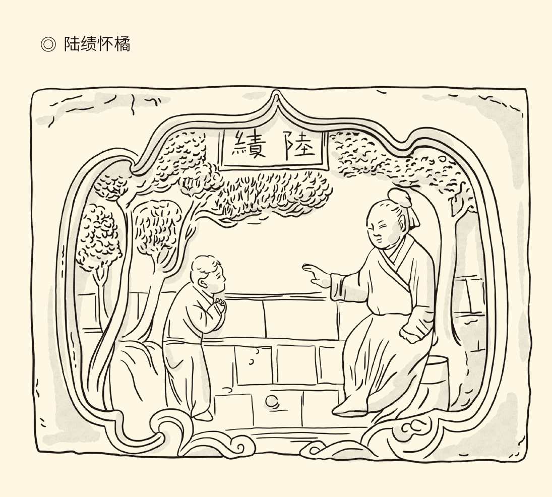 据北京故宫藏品,北宋砖雕“陆绩怀橘”。画面左侧躬身行礼者是六岁的吴郡人陆绩,端坐于右侧树下的是袁术。陆绩怀橘遗母的故事见《三国志》,属“二十四孝”之一。