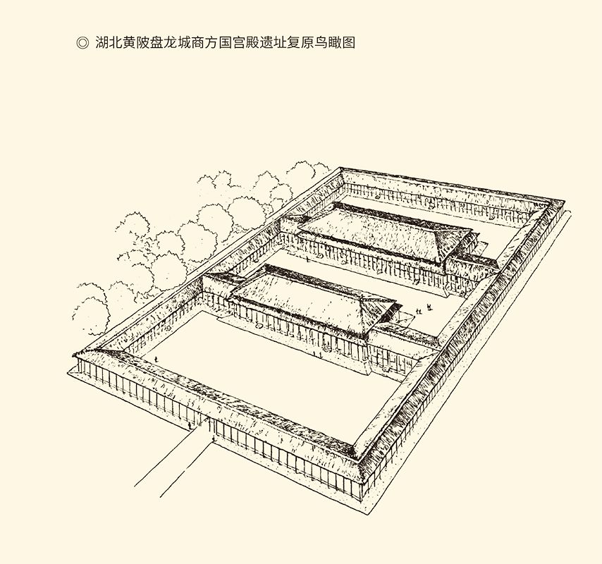 这盘龙城建于商中期,是一座以城为中心的商文化遗址群。城内面积约75400平方米,考古发现三处大型宫殿基址。虽非商王宫殿,但其工程做法、城池、殿堂均与中原殷商都城一致,皆为当时最高的建筑水准。商代宫殿和宗庙建筑,通常有高大的城墙、恢宏的殿堂和以中轴线为中心的对称布局。这些特点为后来历朝历代的皇城宫殿建筑所继承。