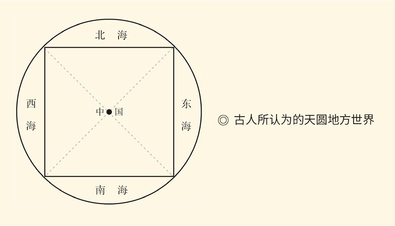 古人认为,我们的世界是由天和地组成的。天在上,地在下;天是圆的,地是方的。高高在上的天就像穹庐,笼罩四野。所以,全世界就叫“普天之下”,简称“天下”。圆溜溜的天扣在正方形的地上,多出的四个地方是海,东西南北各一个,叫“四海”。天下,就在这“四海之内”,简称“海内”。四四方方的“地”画两条对角线,交叉点就是“天下之中”。在那里建设的城市和政权,就叫“中国”。