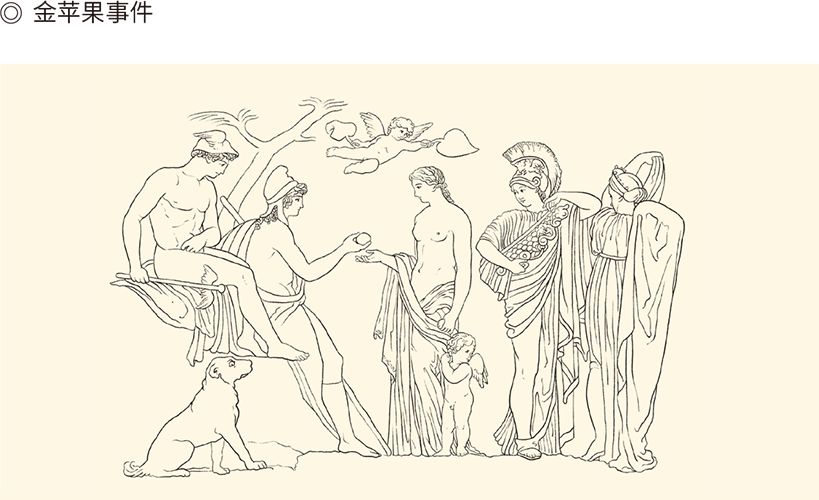 据英国画家约翰·斐拉克曼(John Flaxman)画作,左边是“裁决者”帕里斯,右边是阿芙洛狄忒、雅典娜、赫拉三女神。
