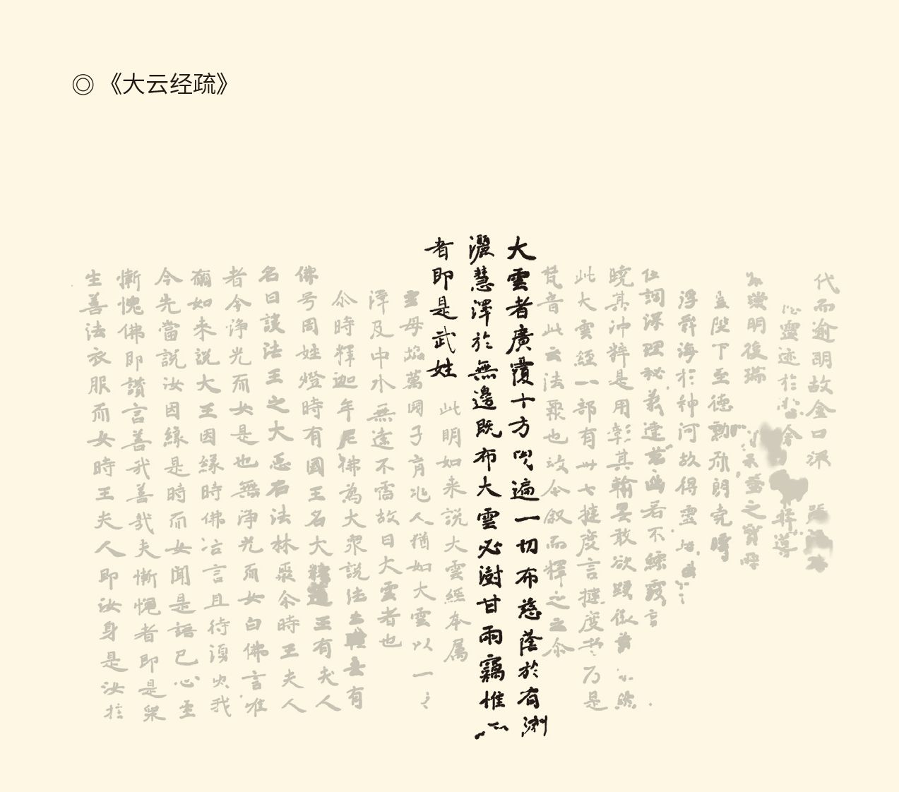 《大云经疏》见于敦煌文书者两处,这里选取的是其中一部分,叙述经卷的缘起。放大部分释文:“大云者,广覆十方,周遍一切,布慈荫于有识,洒慧泽于无边。既布大云,必澍甘雨。窃维云者,即是武姓。”为武则天造势的意图不言而喻。图据《敦煌宝藏》绘制,编号S6502。