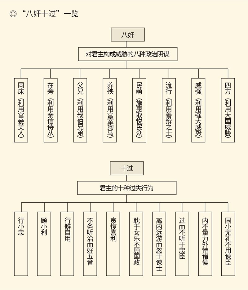 这可是一门技术活。因此韩非的书中,便讲了大量的方法和案例,比如人臣欺君窃国的“八奸”,人君丧权失位的“十过”。这些都主要是说给王侯们听的。毕竟,《韩非子》一书可是国王培训班的教材。