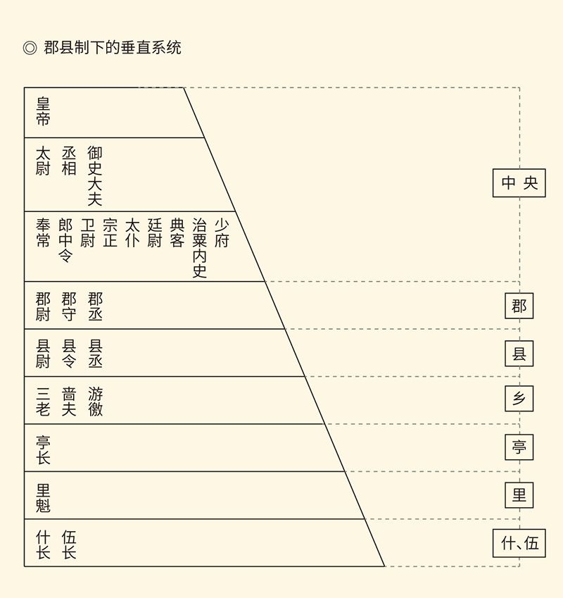 显然,秦的郡县制,是一个自上而下的垂直系统。中央政府管郡,郡管县,县管乡,乡管亭,亭管里,里下还有什和伍。至高无上的是皇帝,最底层的是小民。