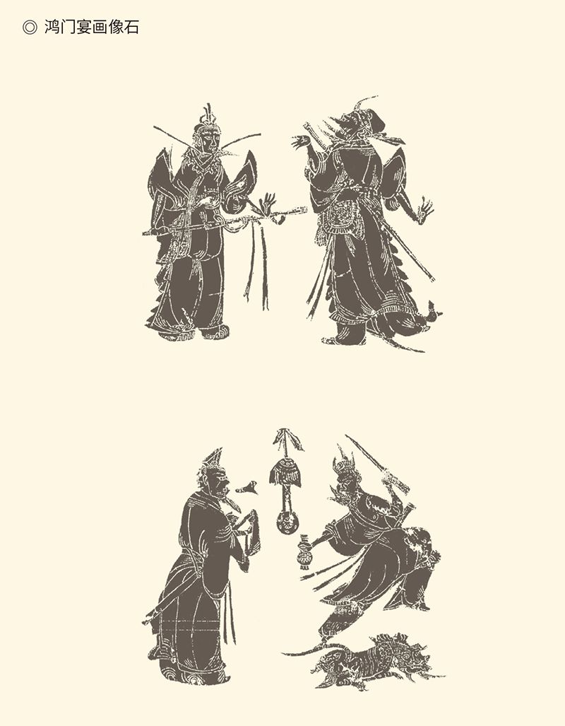 出土于山东沂南北寨村汉墓,原高118厘米,宽76厘米。上图为项庄舞剑,项伯亦拔剑起舞。下图为范增一手举剑,一手执壶,击破玉斗。对面恭立者为张良。图注据张道一《画像石鉴赏》。