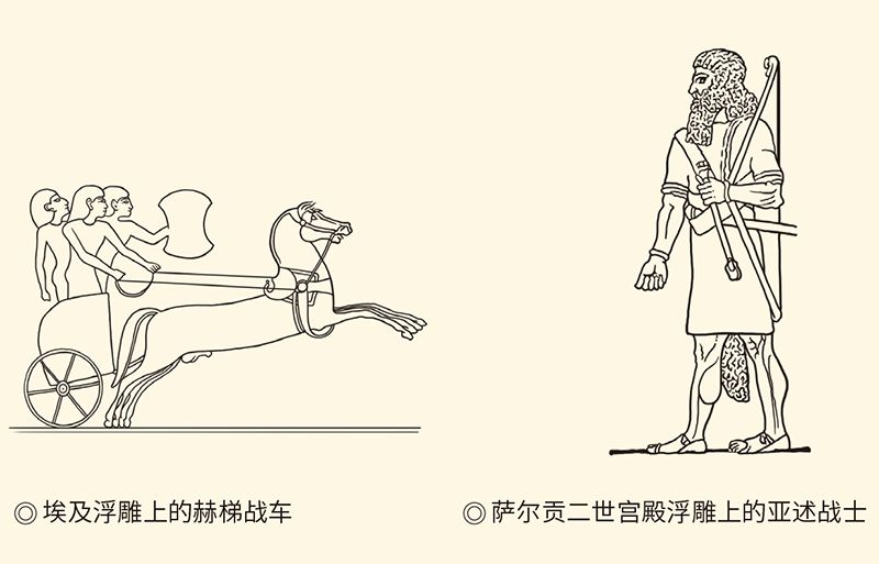 这就跟之前的苏美尔人和赫梯人大不一样。苏美尔人剃光头,穿羊毛紧身衣。赫梯人身材矮小,长鹰钩鼻,男人都梳长辫子,戴耳环。后者克敌制胜的法宝是他们的战车。赫梯人的车上有三个武士,一个驾车,一个持矛,一个持盾,跟中国春秋时期的情况十分相似。
