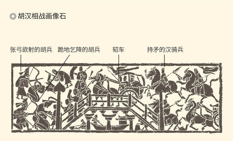 汉朝对匈奴进行长期征战,画中汉朝官兵正与胡兵格杀,双方短兵相接,战斗激烈。