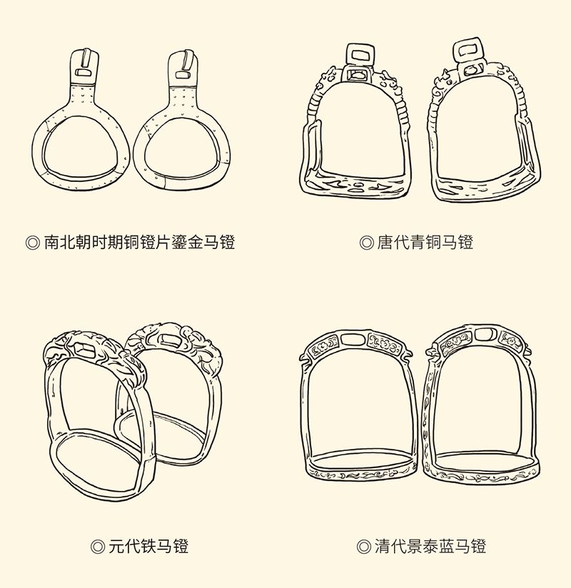 1965年在北票县北燕贵族墓中出土了一对南北朝时期的马镫,木芯长直柄包铜皮,是现存年代最早的马镫实物。自南北朝后,马镫历经改造,形式呈现多样,也逐渐出现银、铁鎏银、铁,甚至景泰蓝等不同材质。