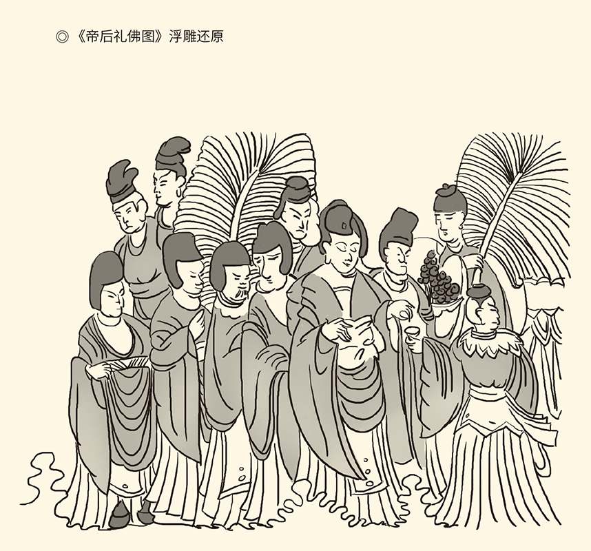 北魏孝文帝礼佛图南北朝时期佛教在中国大规模传播,南北两方政权大都尊奉佛教。北魏宣武帝为纪念父母孝文帝和文昭皇太后,花费二十四年时间在龙门开凿了宾阳中洞,洞口两侧的石壁上,原来有两组大型浮雕,即《皇帝礼佛图》和《皇后礼佛图》。