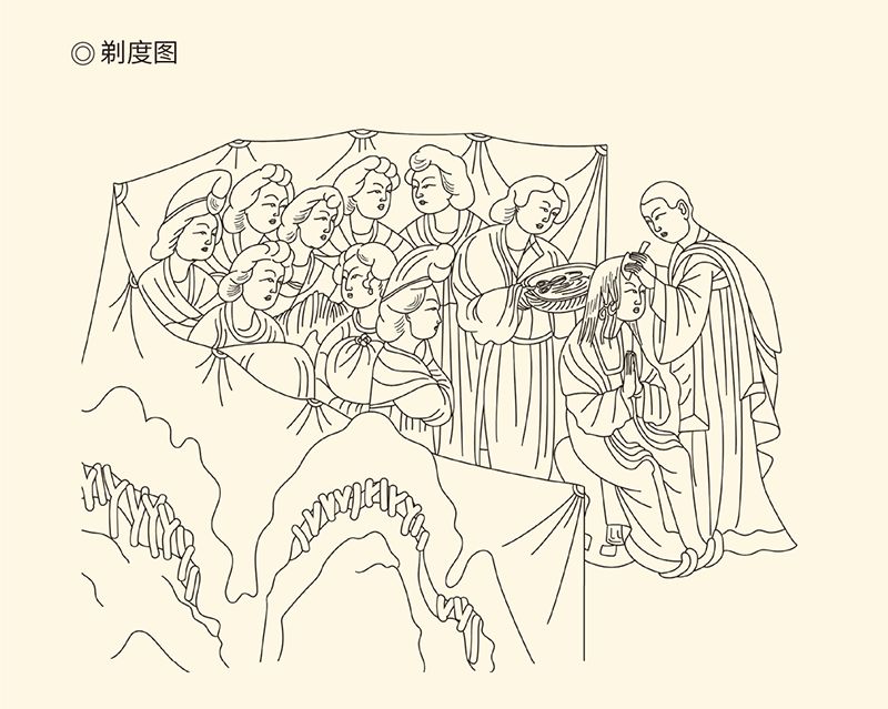 敦煌莫高窟第445窟《弥勒经度》中剃度图局部。
