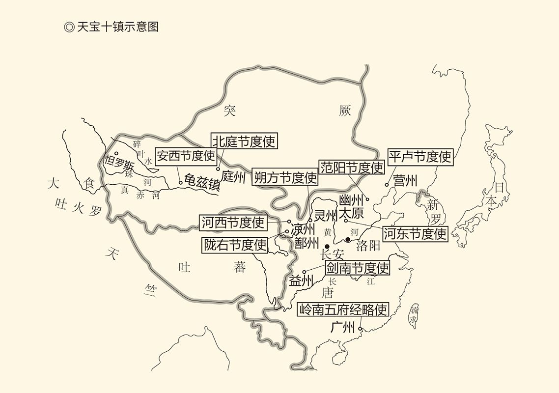 最早设立的藩镇是十个军区,其中九个军区的长官是节度使,一个是经略使,统称“天宝十镇”。这十个军区有五个在西北,三个在东北,一个在西南,一个在华南,战略目标也很明确:保卫关中,进而保住世界帝国的地位。因此十镇的总兵力竟多达四十九万,是中央军的五倍半。[10]