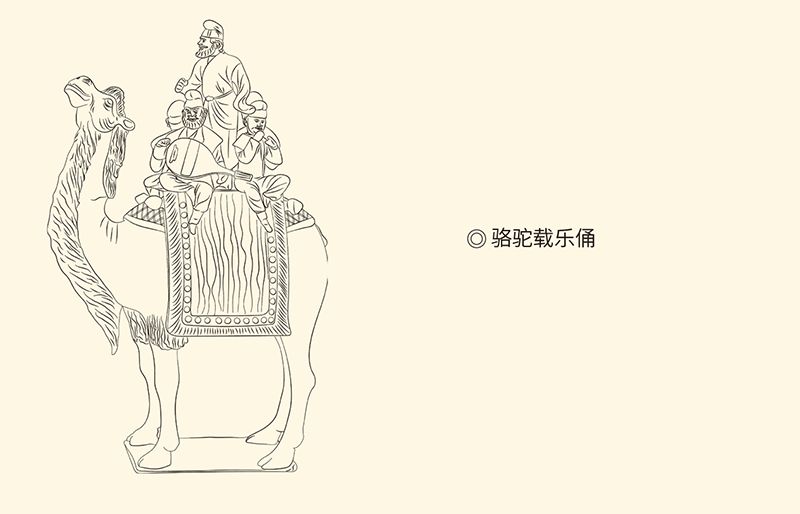 中国国家博物馆藏。唐三彩骆驼载乐俑,出土于西安一座建造于公元723年的陵墓。根据一些乐工的衣饰、胡须和面部轮廓,可断定他们来自中亚。唐朝的陵墓常用陶俑陪葬。陶俑多用中亚男人,包括乐工和照管马或骆驼的人。这些陶俑说明了唐代士族对中亚音乐和商队的喜爱。