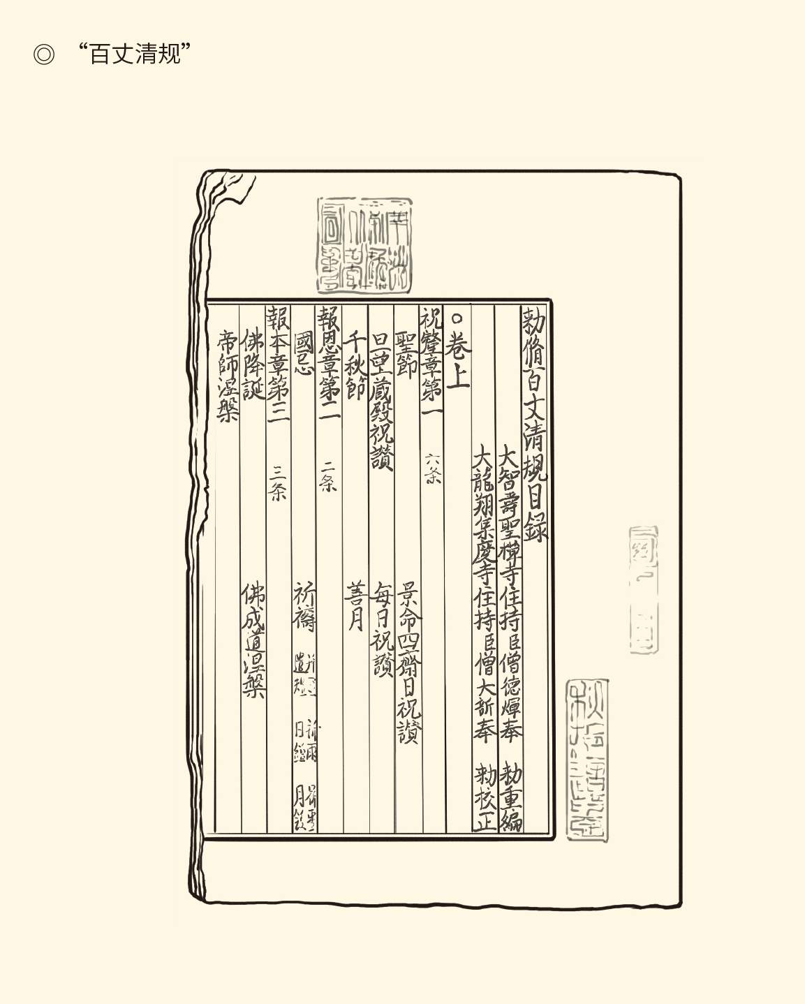 百丈清规的正式名称是“禅门规式”,它明确而详细地规定了禅宗寺院僧团的组织体制、宗教礼仪和生活方式。这些规定经过完善,尤其是在元世祖时奉旨修订后,便成为禅院僧尼必须遵守的丛林清规。丛林是阿兰若(Aranyaka)的梵文汉译,意思是僧侣的修行处,当然也包括禅院。