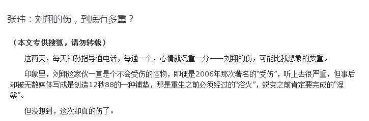 10天前,2008年8月8日,刘翔进驻北京奥运村的那一晚上,搜狐博客约我写了一篇博文。这篇博客,在刘翔退赛那天,被人翻了出来,点击爆棚。很多人在下面留言:噢!原来刘翔是真的受伤啊!