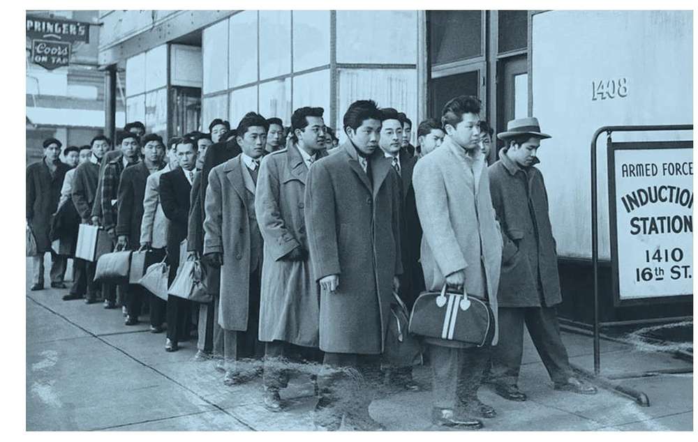 1944年2月22日,来自科罗拉多州安置中心的48名日裔美国人在丹佛征兵站报名参军,准备接受体检