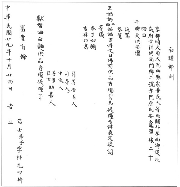 以上的表文须要说明:“引善香首人”便是被柬请并且助有香资供品的本门香头;“司房人”便是司账者;“中伙人”便是厨茶房人;