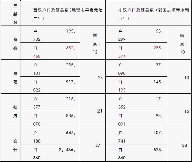 三辅名 西汉户口及辖县数(地理志平帝元始二年) 东汉户口及辖县数(郡国志顺帝永和五年)