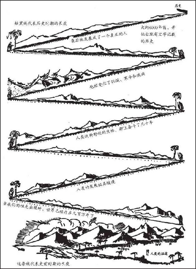 人类最早的祖先是外表丑陋、毫无吸引力的一种哺乳动物。他不仅身材没有现代人高大,而且长期的风吹日晒,把他的皮肤变成了难看的深棕色。他的头和身体的大部分,还有胳膊、腿上都长着粗而长的体毛。他的手指头细而有力,看起来像猴的爪子。他长着一个低陷的前额,下颚就像野兽的一样,习惯于把牙齿又当刀子又当叉。他赤身裸体,不穿衣服。除了偶尔看见隆隆的火山冒出的火焰,还有大地上到处弥散着的烟和火山熔岩外,他还不知道什么是火。