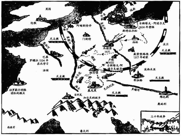 1630年初夏,瑞典国王,瓦萨家族的古斯塔夫·阿道尔丰斯在新教徒的最后一个桥头堡施特拉尔松登陆。古斯塔夫曾因保卫自己的国家抵抗俄国人而一举成名。作为一位野心勃勃的新教国王,他一直梦想着将瑞典变成一个北方大帝国的中心。欧洲的新教徒王公们对古斯塔夫大加欢迎,将他视为路德派的救世主。古斯塔夫旗开得胜,击败了刚刚大肆屠杀马格德堡新教徒居民的蒂利。接着,他率领军队穿越德国腹地,准备袭击哈布斯堡在意大利的领地。由于受到天主教军队的背后偷袭,古斯塔夫突然掉头,在吕茨恩战役中击败了哈布斯堡部队的主力。不幸的是,这位瑞典国王在与自己的部队失散时被杀。哈布斯堡的势力已经被摧毁。