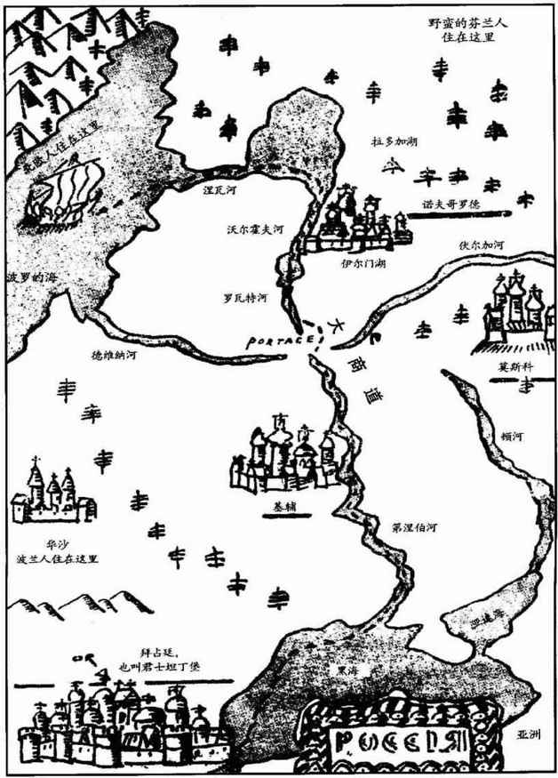 不幸的是,一条便利的商路纵贯了这个国家,扰乱了这群淳朴人民的游牧生活。这就是从北欧通往君士坦丁堡的主要干道。它沿波罗的海岸延伸到涅瓦河口;然后穿过拉多加湖,顺沃尔霍夫河向南前进;之后横渡伊尔门湖,逆拉瓦特小河而上;然后有一段陆上短途直达第聂伯河;最后沿第聂伯河顺流而下进入黑海。