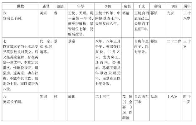 史家记载历代帝皇,有年号,有庙号,有谥法,有陵名。述史者举某一朝之事,任举其一端,或称年,或称庙,或称谥,或称陵。文法不一,所当熟记。又世次之先后,各帝即位之年,享国之数,及其干支之纪岁,任举其朝某事,一屈指而得其上下之距离,时代之关系,所谓知人论世不可少之常识。兹就明代历帝以表明之,冀便记忆。