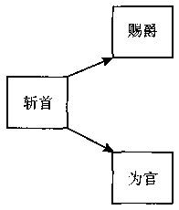 在军功爵创建之初,“爵”好像曾被用作官资。《韩非子·定法》云:“商君之法曰:斩一首者爵一级,欲为官者为五十石之官;斩二首者爵二级,欲为官者为百石之官。官、爵之迁,与斩首之功相称也。”一般认为,这就是有爵就可以做官的证据(80)。过去我也是那么看的,但现在看法变了。细审“商君之法”的意思,是说“斩一首”或“斩二首”就能获得两个机会:第一是获得爵一级或爵二级;第二是做五十石之官或百石之官。那么“为五十石之官”或“为百石之官”,其实是与“斩首”直接挂钩的,不必理解为跟“爵一级”或“爵二级”挂钩。《定法》又云:“今有法曰:斩首者令为医匠,则屋不成而病不已。夫匠者,手巧也;而医者,齐药也;而以斩首之功为之,则不当其能。今治官者,智能也;今斩首者,勇力之所加也。以勇力之所加、而治智能之官,是以斩首之功为医匠也。”这里说的也是“治智能之官”跟“斩首”的关系,而不是“治智能之官”跟“爵”的关系。概而言之,照某些学者的解释,是“以斩首得爵、以爵级为官”;而我们的解释,则是“以斩首而得爵、以斩首而为官”。把二者图示如下: