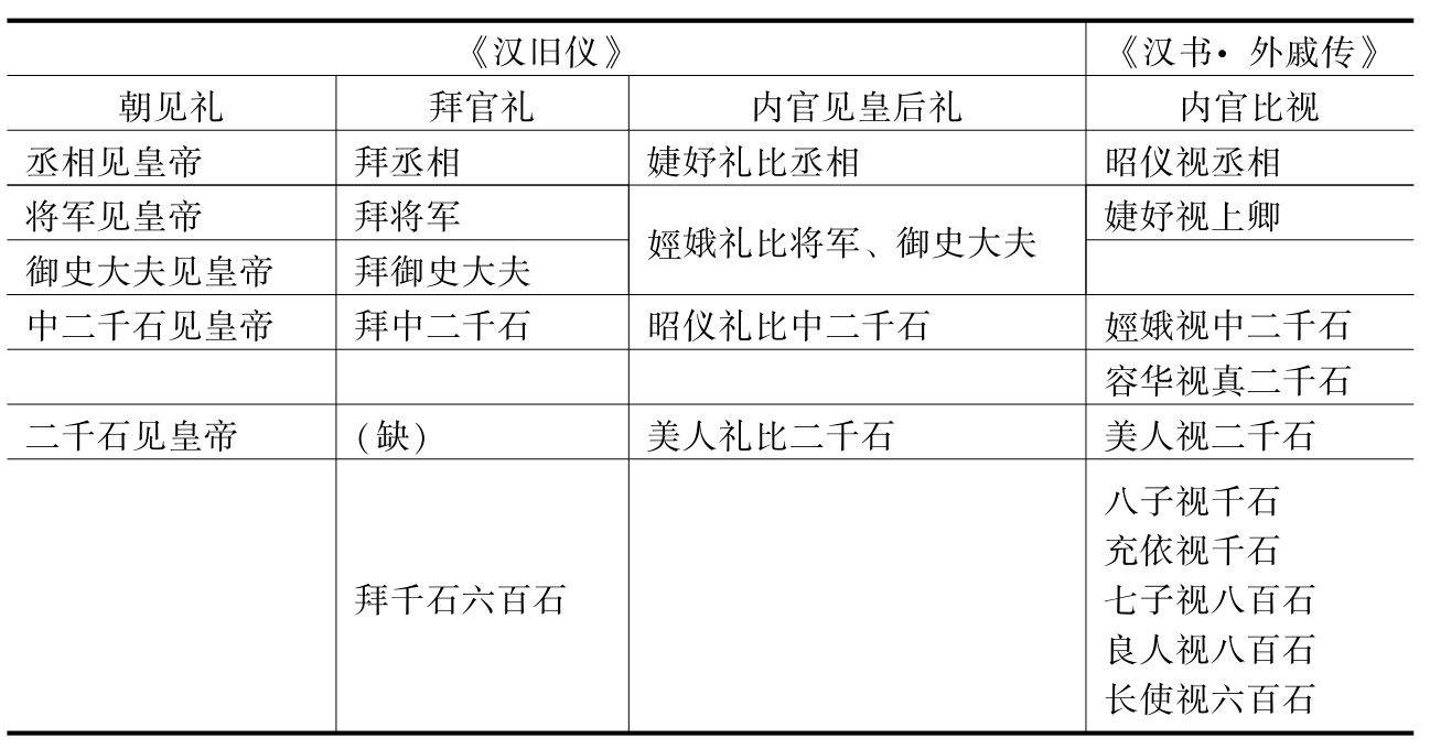 3.婕妤见,大长秋称“皇后为婕妤下舆”,坐称“起”,礼比丞相。娙娥见,女御长称“谢”,礼比将军、御史大夫。昭仪见,称“谢”,比中二千石。贵人见(按贵人当做美人),称“皇后诏曰可”,礼比二千石。(卫宏《汉旧仪》卷上)