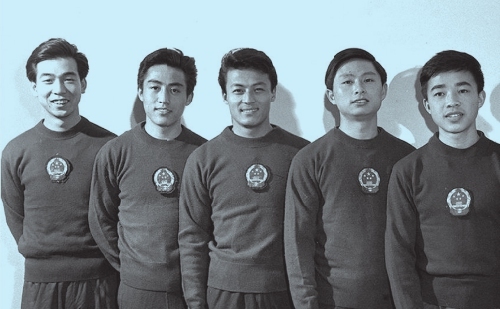 参加第27届世界乒乓球锦标赛男子团体赛的中国男子队选手(从左至右):张燮林、庄则栋、李富荣、徐寅生、王家声(黄景达摄,图片选自《庄则栋自述》,庄则栋、佐佐木敦子著,新华出版社2014年5月版)