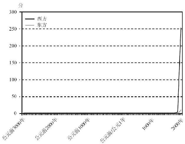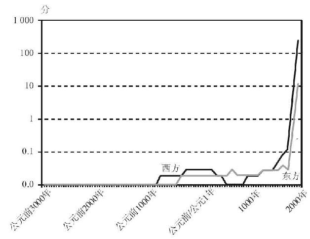 图5.6 公元前3000~公元2000年东方和西方的战争能力(以对数-线性尺度标绘,并将1900年之前的分数降低之后)