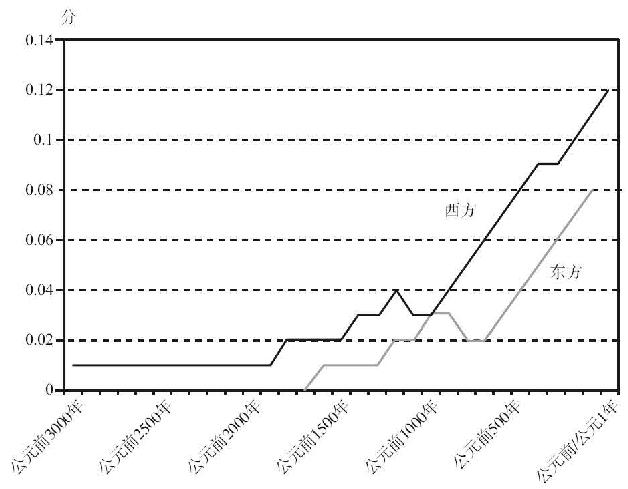 图5.13 公元前3000~前1年东方和西方的战争能力