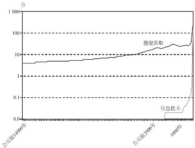图6.6 公元前14000~公元2000年东方能量获取水平与信息技术在对数-线性标尺上的对比(以社会发展分数衡量)