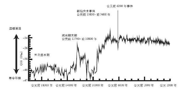 地球的运行轨道变化使得气候冷热交替,收成时好时坏。图2-1显示了南极冰芯氧同位素的比例如何随着气候的变化而变化。直到公元前14000年之后——此时融化的冰川不再把冰冷的水注入海洋中——世界才开始逐渐变暖。公元前12700年左右,气候变暖的速度加快,在短短的时间里,地球的温度就上升了5华氏度左右,直到变成现在的温度。