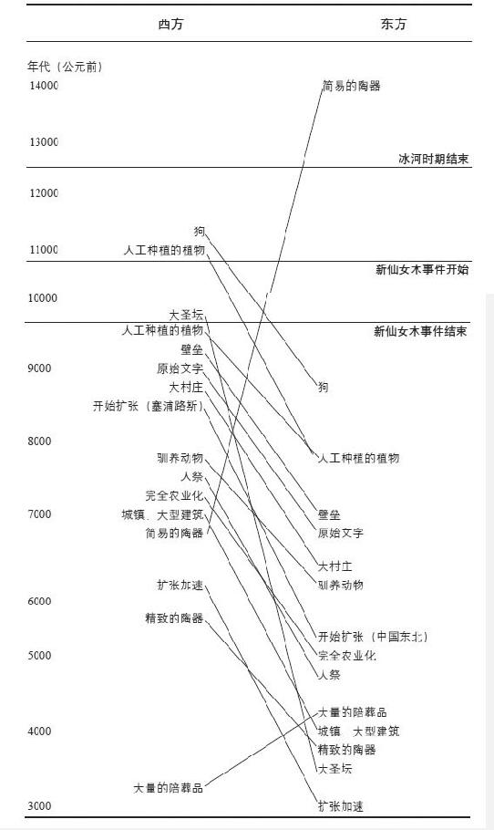 我想我们能够从表2-1得出两个结论。第一个结论是,早期东西方核心区域的发展非常相似。我不想掩饰它们之间存在的差异,例如石器的类型、人们吃的动物和植物,但是,这些差异都不能为我们先前提到的理论提供支持,即在冰河时期后,西方文化的发展方式使得它比东方文化更具潜力,从而解释为什么世界是由西方统治。这看起来并不真实。