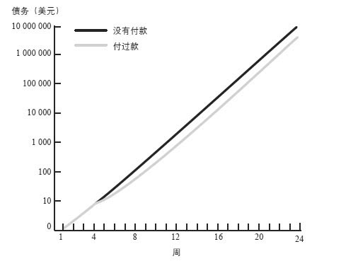 图3-5 预示破产的平滑直线:对数线性刻度表上的债务增长。黑线显示未还款时债务的稳定翻倍,而灰线表现了第5周~第9周小额还款的影响,以及之后停止偿还时又回到翻倍增长的状态