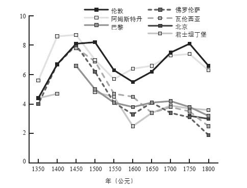 图9-2 1350~1800年间北京和6个西方城市的非熟练工人的实际工资。虽然每个城市每种行业情况各有不同,但是通过测算,几乎每个地方都能发现这一趋势:在1350~1450年间工人的工资水平几乎翻了一番,但之后就开始回落,到1550年或者1600年时工人的购买力已经下降到了1350年前的水平。1600年以后欧洲西北部的工资水平逐渐和欧洲其他地方拉开了差距,这一原因我们将在本章后面详细讨论(巴黎和瓦伦西亚的统计数据始于1450年左右,北京的统计数据始于1750年前后,还有,毫不奇怪的是,1453年前后君士坦丁堡的统计数据存在空缺,因为当时奥斯曼帝国的军队洗劫了该城市)