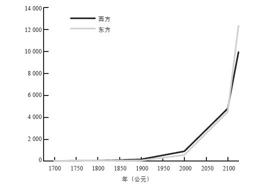 我想,我们不妨对图12-1提出同样的问题。图12-1显示,如果现在东西方社会发展的速度和20世纪时的发展速度一样,那么东方就会在2103年的时候再一次超过西方。但是,由于17世纪以来,社会发展的速度一直在加快,所以图12-1只是一个保守的估计。对这个图最好的解释就是最早要到2103年,西方统治的时代才可能结束。