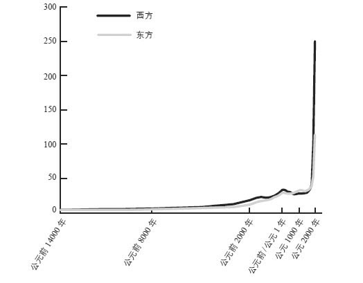 图附-1 仅有能量指数:如果我们只从人均能量获取方面来看,东西方之间的对比是怎样的