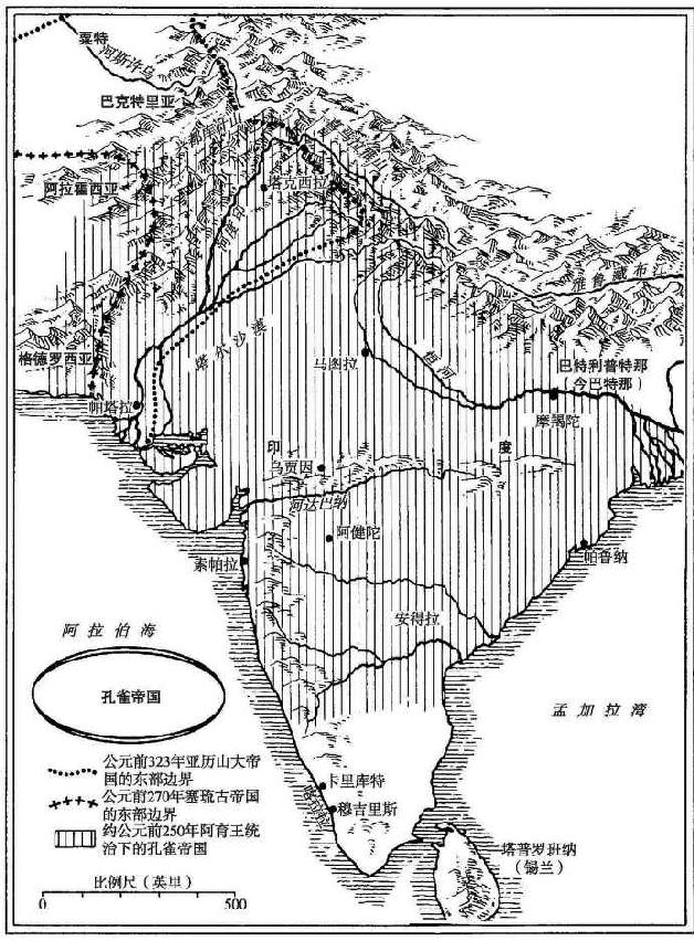 当亚历山大率领军队侵入印度河流域时(公元前327年),恒河流域大多数地区已经统一在摩羯陀王国之下。通过分化当地的防御和结盟,马其顿人对北印度的入侵也许为摩羯陀国王旃陀罗笈多·马赫亚(约公元前321~前297年在位)奠定了基础。在他孙子阿育王(约公元前274~前236年在位)统治下,印度中部和南部(除了极其南端部分外)也被并入孔雀帝国的版图之内。